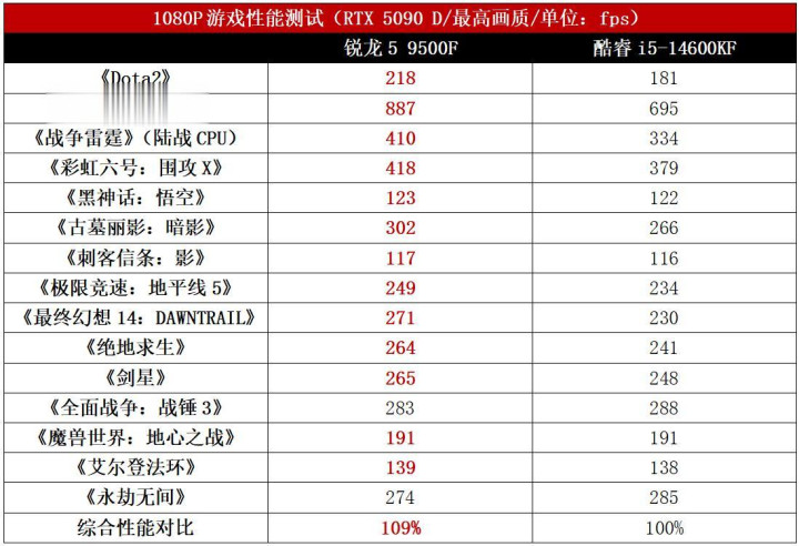 前面对锐龙5 9500F和酷睿i5-14600KF的规格参数进行了详细的对比,那么两款CPU在实际游戏中的表现又如何呢?